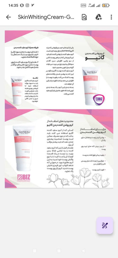 طریقه مصرف کرم سفید کننده بدن یک ابتدا باید پوست محل مورد نظر را با صابون موجود در پکیج، خوب بشویید و با یک دستمال یا حوله کاملا خشک نمایید دو مقداری از کرم سفید کننده را روی پوست محل مورد نظر بمالید و آنقدر ماساژ دهید تا کاملا جذب شود نکته کرم سفید کننده گاتیو باید به صورت روزانه استفاده شود تا اثربخشی بهتری داشته باشد همچنین لازم به ذکر است که استفاده یک بار در روز این کرم در صبح یا عصر کافی خواهد بود.